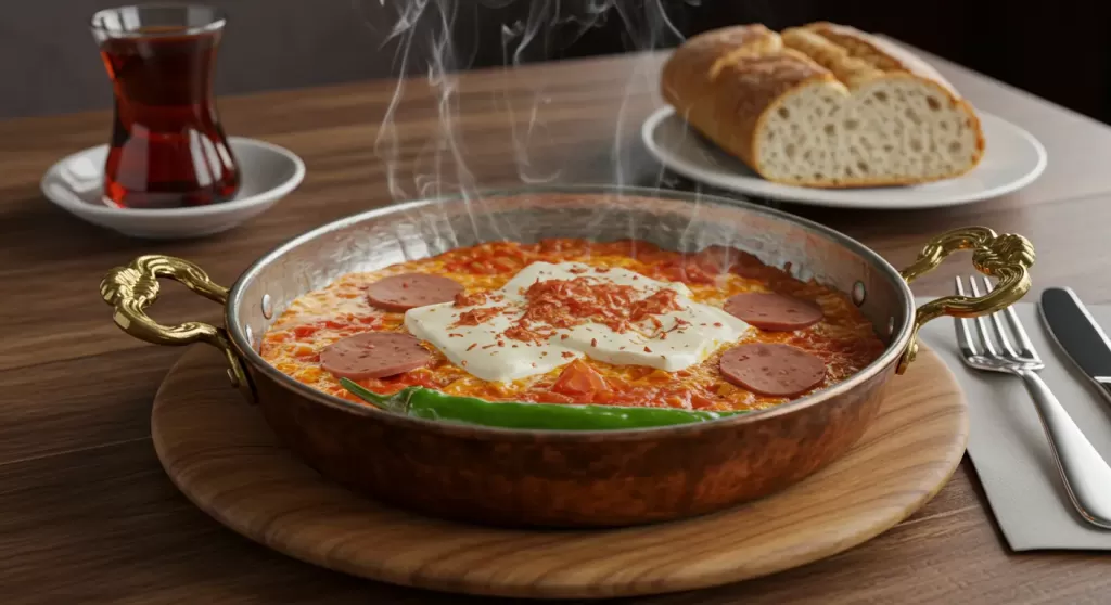 Domates taze biber yumurta kendi özel baharatlarımız ve çemensiz pastırma ile hazırlanıp servis edilmektedir