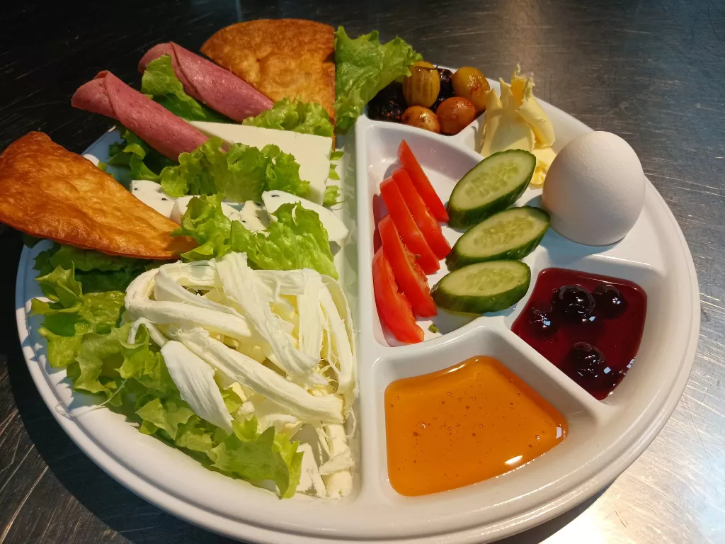 Bir çeşit gerçek Ezine beyaz peyniri olmak üzere, üç çeşit Anadolu peyniri, Gemlik zeytin, Malatya tereyağı, el yapımı reçel, doğal bal, özel gurme kahvaltı sosumuz, gurme salam, özel kahvaltı gevreğimiz, söğüş şeklinde domates salatalık, tercihe göre haşlanmış ya da sahanda yumurta ile servis edilir, iki adet ince belli bardakta Türk çayı fiyata dahildir.