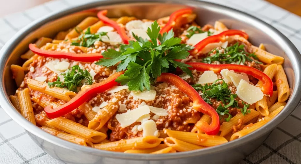Makarna Gaziantep biber salçası soğan domates Gurme baharatlar ve zeytinyağı